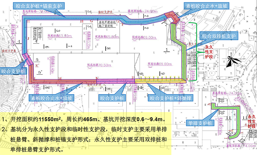 紅(hóng)嶺項目位于深圳市(shì)福田區(qū)安托山(shān)九路(lù)3号,場(chǎng)¥地(dì)位于紅(hóng)嶺中學高(gāo)中部校(xiào)內(nèi)。本工(gōng)程為(wèi)萬科(kē)代建項目,拟建主要(yào)建築為(wèi)原體(tǐ)育館拆除重建1棟♦2層藝體(tǐ)中心及地(dì)下(xià)車(chē)庫改造。本工(gōng)程開(kāi)挖面積約11550m2,周長(cháng)'約465m。基坑開(kāi)挖深度0.60~9.40m。基坑分(fēn)為(wèi)永久性支護段及臨時(shí)支護段,臨時(shí)支☆護段采用(yòng)單排咬合樁懸臂和(hé)樁錨支護形式;永久性支護采用(yòng)雙排咬合樁和(hé)單排樁懸臂♦支護形式。其中Φ1000~1200葷樁321根,Φ1000素樁354根。樁基礎Φ800灌注樁110根,Φ1200灌注樁150根,Φ500AB預應力管樁57根,Φ600高(✔gāo)壓旋噴樁512根。工(gōng)程造價約為(wèi)4000萬元。